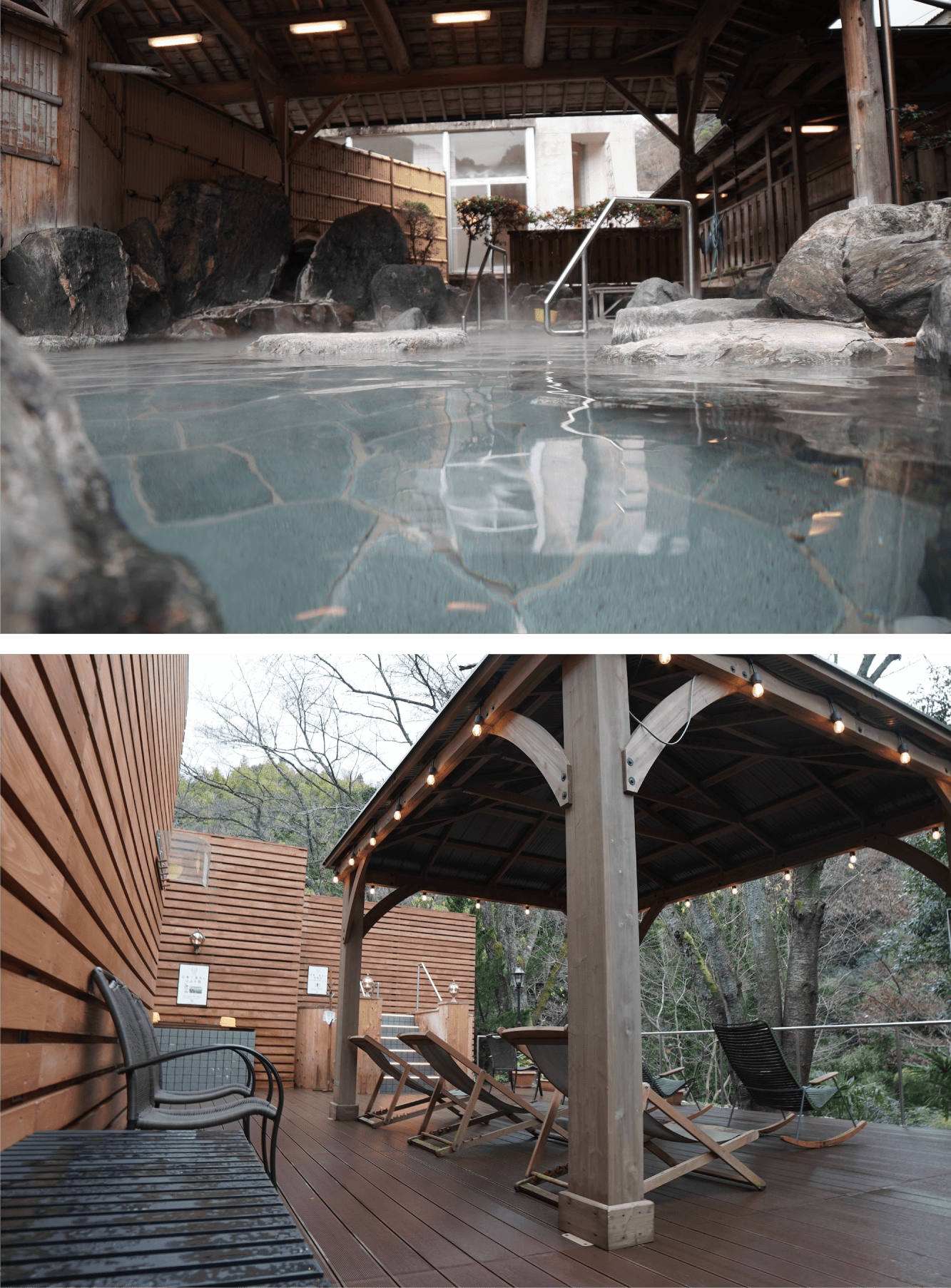 日本三美人の湯をもっと快適に気兼ねなく楽しめる貸切風呂もご用意しています。ご家族やカップルはもちろん、小さなお子様がいる皆様も安心してご利用いただけます。また、2021年にオープンしたサウナエリアは国内のサウナーからの注目度も高く、日本初のセパレート式サウナ、水深160cmの水風呂、季節を感じる外気浴エリアなど愛好家の方にもご満足いただける仕様になっております。泉質は、ナトリウム・カルシウム・硫酸塩塩化物泉 (低張性弱アルカリ性高温泉) で、美肌、神経痛、疲労回復、 健康増進、筋肉疲労など日々のお疲れをぜひ当館で癒してください。
